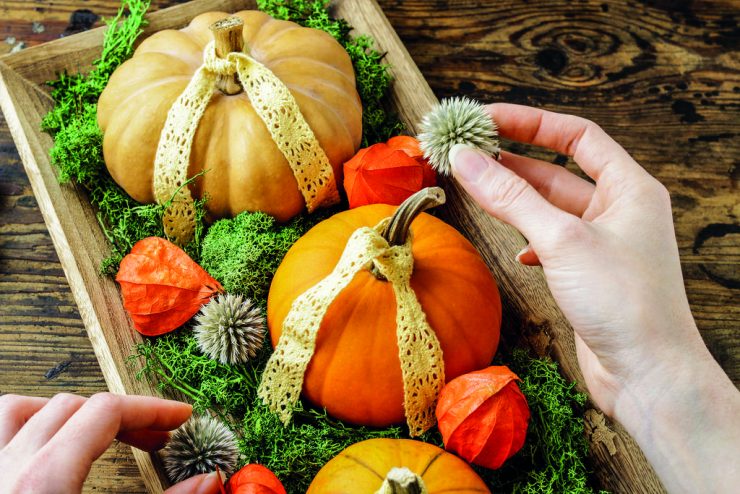 1 Menší dekorativní dýně uspořádejte na dřevěnou misku nebo na tác.