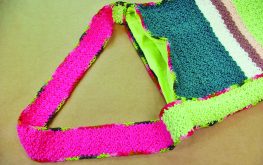 8 Ucho přišijeme podle obrázku k tělu tašky a poté ho celé obháčkujeme duhovou Ginou Crazy. To ucho zpevní, aby se příliš nevytahovalo. Obháčkujeme i tělo tašky. Ideální je tašku, případně i ucho, podšít plátnem. Hotovou tašku perte při 30 °C a pokud je to nutné, žehlete na nejnižší teplotní stupeň.