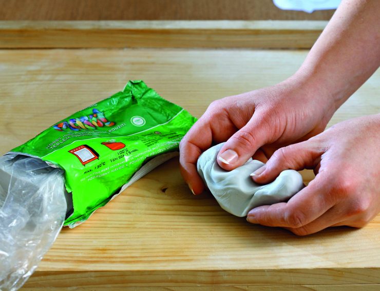 2. Modelovací hmotu z jednoho balení rozdělte na 4 části. Každou část postupně vypracujte rukama, aby změkla, trvá to pár minut.