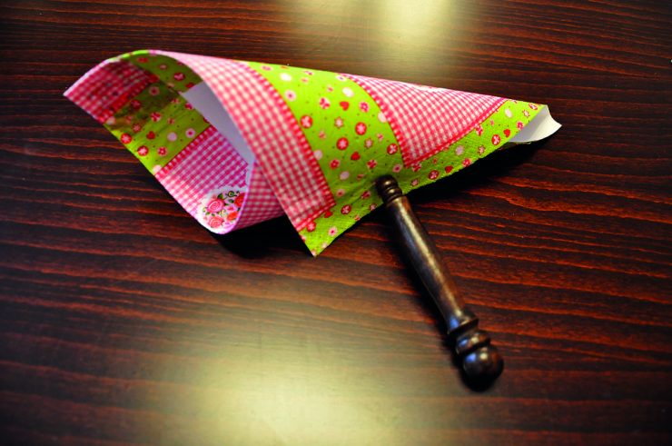 Ubrousek „rozložte“ na tři vrstvy a dále pracujte jen s tou nejtenčí svrchní potištěnou vrstvou. Čtvrtku natřete lepidlem. Dbejte na to, aby byly pečlivě přilepeny především okraje. Zbytek ubrousku můžete odstřihnout nebo postup s lepením ubrousku zopakujte i v budoucí vnitřní části kornoutu.