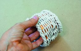 10 Copánek rozdělte na dva díly. Jeden přilepte na vršek košíčku, druhý na spodek.