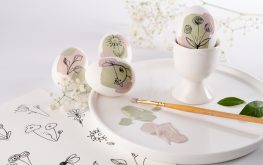 Nechte barvu zaschnout. Mezitím si na papír předkreslete různé jednoduché motivy, kterými budete chtít vejce zdobit. Mohou to být například zjednodušené obrázky květin či jarních větviček, slepičky a podobně. Můžete se inspirovat i na internetu.