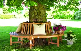 Půlkruhovou lavičku stačí postavit ke stromu, ale také ji můžeme využít opačně, na vnější delší straně vysázet živý plot a sedět a povídat si uvnitř „půlkruhu“