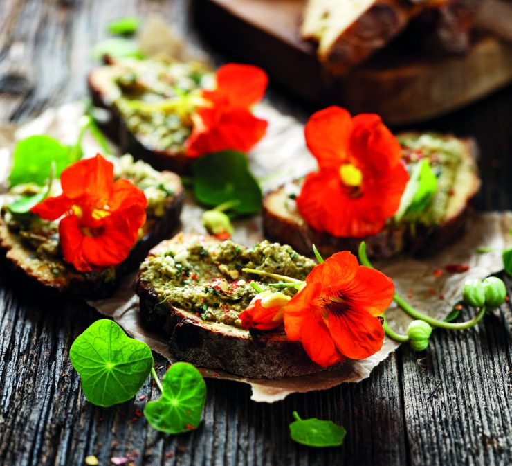 Velký svazek medvědího česneku a další čerstvé byliny (například pampeliškové listy nebo listy rokety) rozmixujte s hrstí kešu nebo piniovými oříšky. Při mixování přilévejte kvalitní olivový olej a nakonec přidejte nastrouhaný parmazánu. Pesto dosolte podle chuti. Plátky čerstvého tmavého chleba lehce nasucho opečte na rozpálené pánvi, potřete pestem a dozdobte čerstvými květy lichořeřišnice.