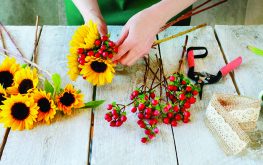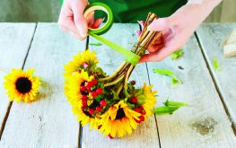Každý květ slunečnice doplňte větvičkou s bobulemi. Skládejte je těsně k sobě a vytvářejte kompaktní kytici kulovitého tvaru.