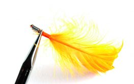 3 Připravte si všechna pírka k zavěšení tak, že každé z nich navlečete do kulaté koncovky na kůži a poslední očko zamáčknete plochými kleštěmi. Na spojovací kroužky si zavěste akrylové přívěsky. Použijte dvoje ploché kleště nebo jedny a své prsty.