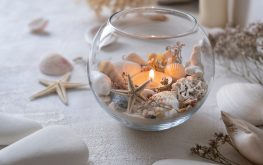 Krásný svícen pro vytvoření příjemné večerní atmosféry si můžete snadno vytvořit z větší čiré sklenice, lahve či vázy, do které nasypete trochu písku a naaranžujete mušle a oblázky. Pak už jen stačí vložit zapálenou čajovou svíčku a umístit svícen na stůl.