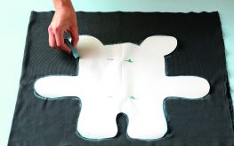 l. Látku přehněte napůl, lícovou stranou směrem ven, a nakreslete na ni maketu medvěda.
