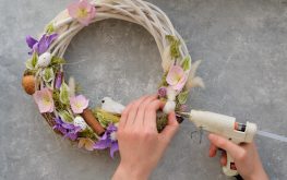Na proutěný základ věnečku připevněte s pomocí tavné pistole kousky zeleného mechu, umělé květy a další dekorace podle svého výběru. Část proutí nechte nenazdobenou.