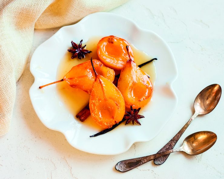 Hrušky oloupejte, překrojte napůl a vykrojte jádřince. Cukr nechte lehce zkaramelizovat v kastrůlku, zalijte vínem, přidejte hrušky a koření a nechte povařit, dokud ovoce nezměkne.