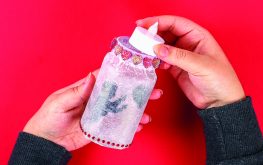6 Dolní i horní okraj sklenice ozdobte samolepicími šatony a srdíčky.