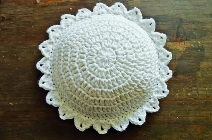 Sháčkujte až do konce, ukončete PO a po celém obvodu uháčkujte ozdobné lemování z volánků: