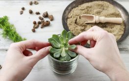 Na dno pěkného hrnečku či jiné nádobky, do které chcete sukulent zasadit, nasypte trochu písku, perlitu či jiné vhodné drenáže, která nahradí chybějící otvory pro odtok přebytečné vody.