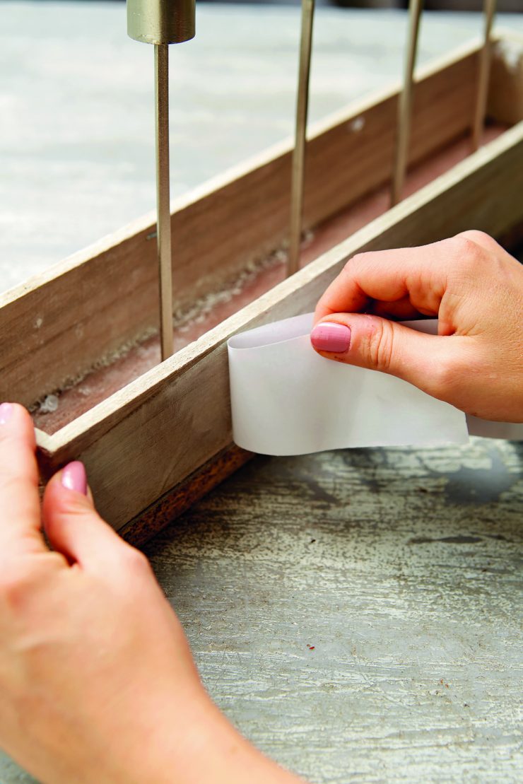 3 V dalším kroku nalepte oboustrannou lepicí pásku na vnější stranu dřevěné krabice a sloupněte kryt z vrchní strany.
