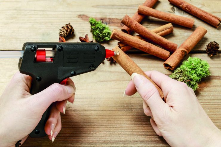 1 S pomocí tavné pistole nejprve slepte ze 4 smotků skořice rámeček zhruba ve tvaru čtverce.