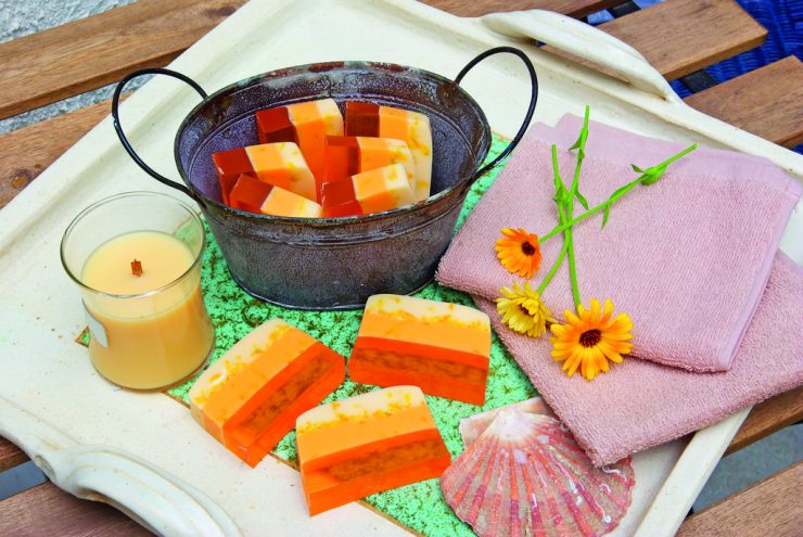 4 Transparentní hmotu obarvěte na tmavší odstín oranžové a přidejte opět silici. Horkou hmotu nalijte do krabice.