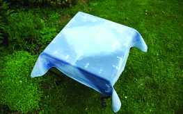Ubrus v jemných modrých tónech snadno vytvoříte pomocí kolíčkové batiky. Kolíčková batika je technika, při které se jako rezerváž používají obyčejné kolíčky na prádlo ve spojitosti se sklady použité látky. Látka musí být ze 100% přírodního materiálu, z bavlny, hedvábí, vlny nebo lnu. Ubrus složte nejprve na polovinu, dále na čtvrtinu a skládejte dál, až vytvoříte nejmenší čtverec, jaký si přejete a jaký lze ještě sepnout kolíčky. Náš ubrus má velikost 90 x 90 cm a složili jsme ho tak, že nám celkově vzniklo 16 čtverců o velikosti 22,5 x 22,5 cm. Každý sklad, který vytvoříte, pečlivě zažehlete. Jakmile máte sklady hotové, vezměte vzniklý čtverec a sepněte ho po stranách kolíčky na prádlo. Kolíčky upevňujte v pravidelných rozestupech. V místech, kam je dáte, vzniknou světlé stopy.